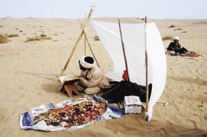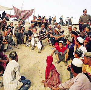 2004年6月,和田市和田縣庫(kù)克馬日暮麻扎,民間藝人在表演說(shuō)唱
