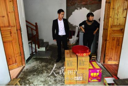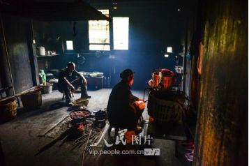 一般要到快過春節(jié)的時候,男方家才專門請人去接女方來洗糯米、打糍粑,新娘方能在夫家住上一夜;在來年農(nóng)忙時節(jié),又接女方來幫忙,夜里仍不能在男方家留宿,幫完忙當晚即回去,只有待到女方有身孕后,新娘才到夫家長住。圖為11月16日夜,新娘潘芝銀家為準備婚禮,燈火徹夜長明。
