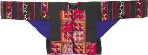 再來(lái)看這件藏品:彝族五彩棉拼布對(duì)襟女上衣。第一眼吸引人的,應(yīng)該是那鮮艷的色彩和可愛的小三角,鮮艷、喜慶、熱鬧,它幾乎符合人們對(duì)于少數(shù)民族服飾的一切想象。仔細(xì)觀察、品讀后,可發(fā)現(xiàn)這件上衣細(xì)節(jié)的妙趣之處:第一,雖然衣身的色彩鮮艷,可所有顏色都被制作者按對(duì)比色的關(guān)系排列著——紅與綠、藍(lán)與黃、黑與白,呈現(xiàn)出活潑跳躍、多而不亂的效果。第二,服裝上所有的圖形元素,不是用三角形組合成方形,就是方形中套著三角形——腋下兩塊藍(lán)色的三角結(jié)構(gòu)是由方形對(duì)折而來(lái);領(lǐng)口也沒有裁成常規(guī)的圓領(lǐng),而是做成了與衣身拼布相呼應(yīng)的方形。如此一來(lái),各種零碎的裝飾元素被牢牢地統(tǒng)一的方形框架中,顯得協(xié)調(diào)有序,又不失細(xì)節(jié)趣味。