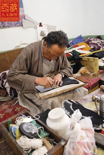 坐在工作臺(tái)上的赤列塔青,身材高大,穿一身合體的淺色藏裝,前擺上沾著幾星鼻煙,長期用針的手指有些變形。翻開他的履歷發(fā)現(xiàn),赤列塔青可以說是拉薩少有的制靴世家,他的父親邊巴頓珠在舊社會(huì)是個(gè)給人支差的貧苦鞋匠,靠給有錢人修鞋、做鞋為生。今年68歲的赤列塔青性格沉穩(wěn)、做事穩(wěn)健,他12歲當(dāng)學(xué)徒工,做鞋做了56年,如果再加上父輩的修鞋歷史,時(shí)間更長。在今天的拉薩有這樣經(jīng)歷的人算是屈指可數(shù)了。赤列塔青從小就在父親和師傅身邊打下手,逐漸掌握這個(gè)足以養(yǎng)家糊口的一技之長,終于成長為一個(gè)勤奮而多才的手工藝人,開始了穩(wěn)坐一隅的匠人生涯。