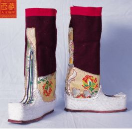 西藏高原地域遼闊,每個(gè)地區(qū)都有屬于自己的鞋子。藏族男女鞋,外觀雖然很像舞臺(tái)上古裝戲里穿的靴子,但用牛皮做底,底高二寸,腰高至小腿之上,鞋面用紅綠相間的毛呢裝飾,鞋腰也有線條、花紋,鞋幫用各色絲線或各色皮革、氆氌、金絲緞制成。人們能從一個(gè)人所穿的鞋子判斷出一個(gè)人的職業(yè)和社會(huì)階層。