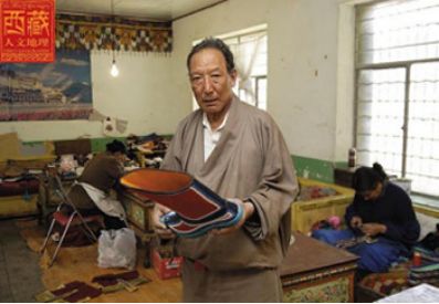 坐在工作臺(tái)上的赤列塔青,身材高大,穿一身合體的淺色藏裝,前擺上沾著幾星鼻煙,長(zhǎng)期用針的手指有些變形。翻開(kāi)他的履歷發(fā)現(xiàn),赤列塔青可以說(shuō)是拉薩少有的制靴世家,他的父親邊巴頓珠在舊社會(huì)是個(gè)給人支差的貧苦鞋匠,靠給有錢人修鞋、做鞋為生。今年68歲的赤列塔青性格沉穩(wěn)、做事穩(wěn)健,他12歲當(dāng)學(xué)徒工,做鞋做了56年,如果再加上父輩的修鞋歷史,時(shí)間更長(zhǎng)。在今天的拉薩有這樣經(jīng)歷的人算是屈指可數(shù)了。赤列塔青從小就在父親和師傅身邊打下手,逐漸掌握這個(gè)足以養(yǎng)家糊口的一技之長(zhǎng),終于成長(zhǎng)為一個(gè)勤奮而多才的手工藝人,開(kāi)始了穩(wěn)坐一隅的匠人生涯。