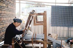 望謨縣布依族的土布按用途和制作工藝大致可分為兩種:純色布與格子花布。前者是先把棉線織成白布,然后放入染缸,染成深淺不同的藍(lán)度。布依族尚黑,老人愛穿黑衣,顯得莊重,年輕人一般穿淺一點(diǎn)的藍(lán)色。因?yàn)槭琴N身衣物,質(zhì)地相對(duì)細(xì)軟。格子花布則略厚韌一些,要先將棉線染成深藍(lán)、中藍(lán)、淺藍(lán)、灰、深灰、青等顏色,再上織機(jī)織出不同的格子紋樣,也有做條紋的。這種布通常需要五幅拼在一起做成床單,夏天躺上去,尤其是在通風(fēng)性沒那么好的水泥樓房里,就像睡在竹席上一樣清爽,一整夜都不會(huì)濕汗,同時(shí)又沒有竹席的冰涼。等到冬天,它又暖和貼身,十分好睡。另外還有一種婦女用來包頭的格子布,摸上去軟和些。