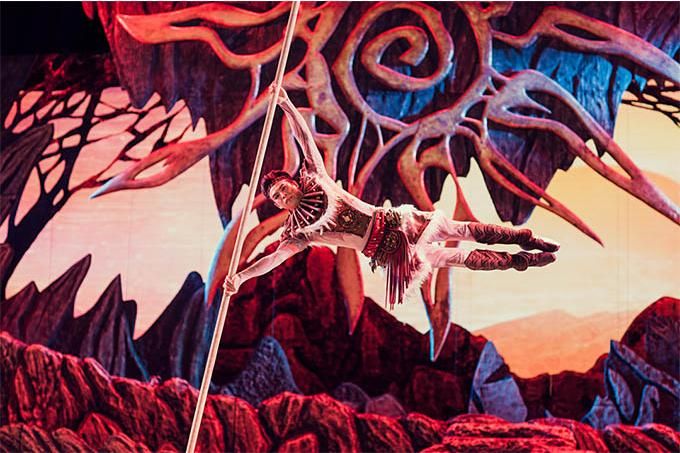 雜技藝術(shù)在劇場空間維度的呈現(xiàn),一是把身體作為一種最為本質(zhì)的符號材料進行直接表現(xiàn);二是通過與物體、音樂、舞蹈、燈光、唱詩等的排列組合,展示技藝的身體與物體、空間的關(guān)系,達到彰顯其生命意蘊與美學品質(zhì)的目的。劇中網(wǎng)吊、綢吊、轉(zhuǎn)動桿上技巧等項目非常炫技,展現(xiàn)了現(xiàn)代雜技的審美意境,詩與思在舞臺上相得益彰。綢吊極具浪漫色彩,承載著輪回與終極的生命哲理;智者的“唱詩”,凸顯了該劇的史詩特征,增加地域文化和遠古歷史的厚重感。