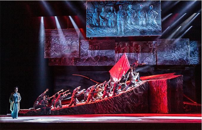 在舞蹈語(yǔ)言的設(shè)計(jì)上,編導(dǎo)融入當(dāng)代元素,使觀眾不但感受到審美的親切與現(xiàn)代感,而且還自然地進(jìn)入回望歷史的情境,對(duì)其思想內(nèi)涵的理解更為準(zhǔn)確。該劇的道具使用和調(diào)度也頗為大氣,令人印象深刻。一組斜坡?tīng)畹拇笮臀枧_(tái)道具不但由群眾演員直接移動(dòng)而實(shí)現(xiàn)即時(shí)的場(chǎng)景調(diào)度,還可使演員上下和左右而行,最終組合成巨大的中國(guó)共產(chǎn)黨黨徽,輔助完成了人民英靈和英雄的形象塑造。