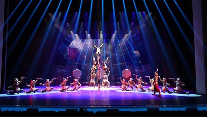 雜技是這部劇的一大亮點(diǎn)。新疆生產(chǎn)建設(shè)兵團(tuán)雜技團(tuán)近年來編創(chuàng)了《天鵝湖—男子倒立技巧》《向太陽—繩技》《春之韻—女子造型》等多個精品節(jié)目,并在國內(nèi)外重大雜技賽場多次獲獎?!稑翘m尋夢》中,主創(chuàng)團(tuán)隊將這些獲獎節(jié)目進(jìn)行拆解,將蹬鼓、獨(dú)輪車、吊環(huán)、肩上芭蕾、水流星及舞中幡等雜技技巧與戲劇元素相融合,讓觀眾猶如置身于黃沙漫漫的絲路古國。