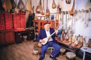 民族樂器制作技藝(維吾爾族樂器制作技藝)國家級傳承人艾依提·依明在家中樂器陳列室演奏民族樂器。新華社記者 張曼攝