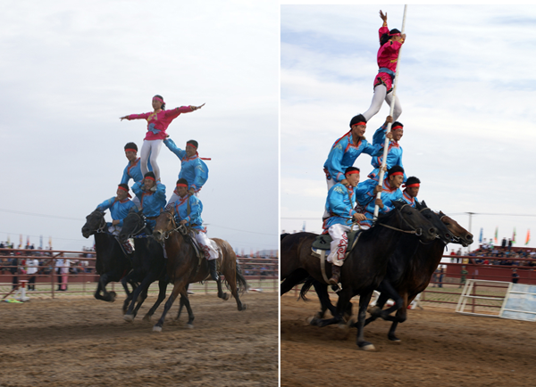 蒙古族的馬術(shù)表演非常精彩,有很多項(xiàng)目?!翱缭秸系K”是在運(yùn)動(dòng)場跑道上每隔幾十米設(shè)置一個(gè)高1米的跨欄。跑道終端立著一個(gè)直徑約2米的火圈,矯健的坐騎從起跑線踏蹄起跑,越過跨欄,鉆過火圈直達(dá)終點(diǎn)?!俺笋R斬劈”是在200-250米的距離之間樹起十幾個(gè)目標(biāo)。騎手們手持馬刀,疾馳如飛,經(jīng)過一個(gè)個(gè)目標(biāo)時(shí)舉刀劈砍,刀起標(biāo)落。“馬上技巧”是由運(yùn)動(dòng)員們在飛馳的馬背上做出各種造型動(dòng)作。運(yùn)動(dòng)員一般八九歲就要在馬術(shù)隊(duì)接受嚴(yán)格的訓(xùn)練。技巧表演可分單項(xiàng)和多項(xiàng),其中又包括單人單馬、單人雙馬、雙人雙馬和多人多馬。一匹飛奔的馬經(jīng)過騎手身邊,騎手可以突然抓住馬鬃翻身上馬,又會(huì)突然下馬腳尖點(diǎn)地再躍上馬背。其他技巧還有在馬背上“空翻倒立”“側(cè)方隱蔽”“樓里藏身”以及驚險(xiǎn)的“馬上疊羅漢”等表演【如圖,劉軍攝影,編者修剪合成兩圖】。