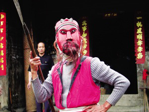 陽(yáng)戲是一種原生態(tài)戲劇,其中道具的使用必不可少。主要包括服裝、面具、法器、樂(lè)器。面具在陽(yáng)戲表演中占有突出的地位,是神靈的憑依和具象化。其面具有關(guān)圣帝、皇生、小生、老生、老丞相、元帥、老臣等共16面。在陽(yáng)戲表演中,旦角(貴妃)是沒(méi)有面具的,搭帕子在頭上,身穿旦角服裝。面具為白楊木質(zhì)材料,精雕細(xì)琢,上面覆以濃重的彩繪。面具造型別致古樸,以頭冠和面相的特征區(qū)分角色,在藝術(shù)風(fēng)格上頗具地方特色。