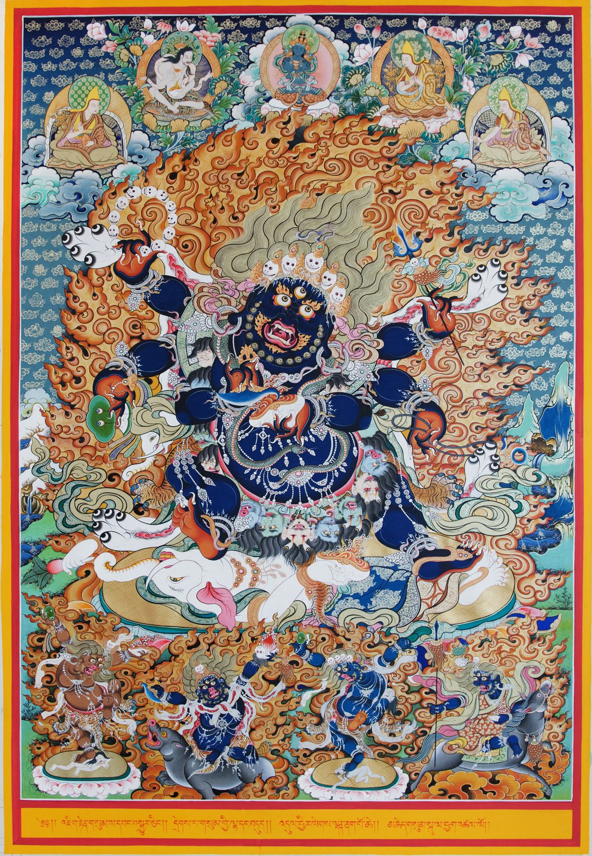 他面容猙獰恐怖,獠牙外露,三目圓睜怒視。頭發(fā)向上直立,眉間點(diǎn)有朱砂“仙都那”印記(梵文Sindura),象征一切空行之懷懾力量。頂戴五骷髏冠,項(xiàng)配五十新鮮頭顱。如果仔細(xì)觀看唐卡中護(hù)法頭部頂端,飾有一個(gè)小小的金剛杵,這是用來象征不動(dòng)金剛。