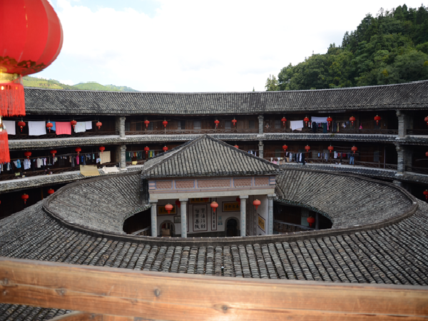 一座土樓就是一個藝術(shù)殿堂。每一座土樓,又如同一個“大家族,小社會”。土樓內(nèi),居住在同一屋頂下的幾十戶幾百人同祖同宗同血緣同家族,過著共門戶、共廳堂、共樓梯、共庭院、共水井的和睦生活。這種聚族同樓而居的生活模式,典型地反映了客家人的傳統(tǒng)家族倫理和家族的親和力。而且,樓內(nèi)的客家人,住著層數(shù)相同、開間面積相等、無明顯朝向差別、更無貴賤等級之分的均等居室。平等聚居,反映了客家人融洽和睦的家風(fēng)和平等團結(jié)的傳統(tǒng)。