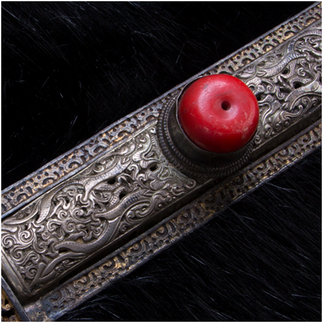 康區(qū)人性格粗獷豪放,刀對于他們來說,主要是戰(zhàn)斗的武器,他們愛刀勝過愛牛羊,一把好刀就是一筆財(cái)富,其形象也會(huì)因之而無形中高大起來。正因?yàn)槿绱耍麄儾粌H對刀本身有較高的要求,對其作為襯托武士氣概的刀的外在形制也有特殊的喜好。刀鞘材料一般使用黃、白銅或純銀,鑲珠嵌寶,正面雕龍畫鳳,背面線刻卷草,佩在身上,起到了美觀和威懾的雙重作用。