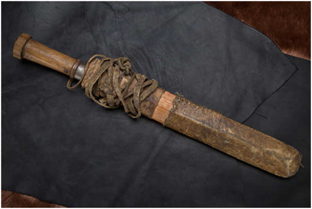 腰刀,骨柄,鐵鞘縷空,獸皮勒鞘,清代