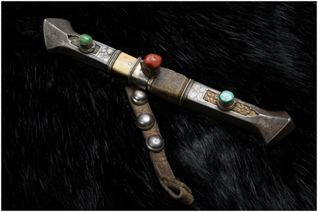 安多地區(qū)主要以放牧為主,牧民的刀主要用于宰殺和吃肉,有嚴(yán)格的男用女用之分,男式刀長度在一尺以上,女式刀在一乍左右,刀鞘的底部和刀柄的末端上翹,呈船形。安多人喜歡珠寶,頭飾、胸飾、腰飾無不光燦耀人,這些飾物同樣被用在刀上,刀鞘和刀柄錨金錯(cuò)銀,鑲嵌著珊瑚和綠松石,像精美的藝術(shù)品。
