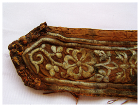 中國民族博物館館藏的臥鹿紋金繡弓囊通長72CM,最寬處25CM,最窄處6.5CM。面料為絹地,呈深褐色。專家推斷其入土前應內襯樺樹皮或獸皮類框架。弓囊正面以銀裹金錢繡滿圖案,整體金碧輝煌。由于埋藏地下數(shù)百年,弓囊兩端的鐵質穿環(huán)和皮條已銹蝕腐爛。