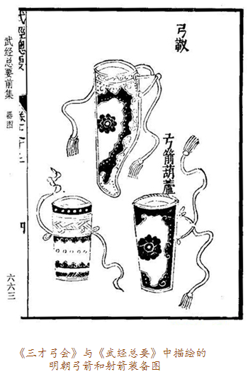 當弓囊出現(xiàn)在眼前時,我們應當想到它的另一半——箭囊。實事上,古代盛裝弓箭的器物被稱為櫜鞬(gāo jiàn),櫜盛箭,鞬裝弓,多以皮革制作。比如明十三陵出土的萬歷皇帝陪葬品櫜鞬,就用皮革縫制,外敷黃色素緞,金繡龍紋,鑲嵌金飾件及各色寶石。一般來說,弓囊為上寬下窄的袋形,箭囊則為長方形。在蒙古語中,弓囊與箭囊合稱為“撒答”。因為“答”與“袋”讀音相近,所以元代的漢族作家便在作品中將之寫為“撒袋”。這樣,“撒袋”一詞便入了漢語詞匯,特指裝弓盛箭的袋子。