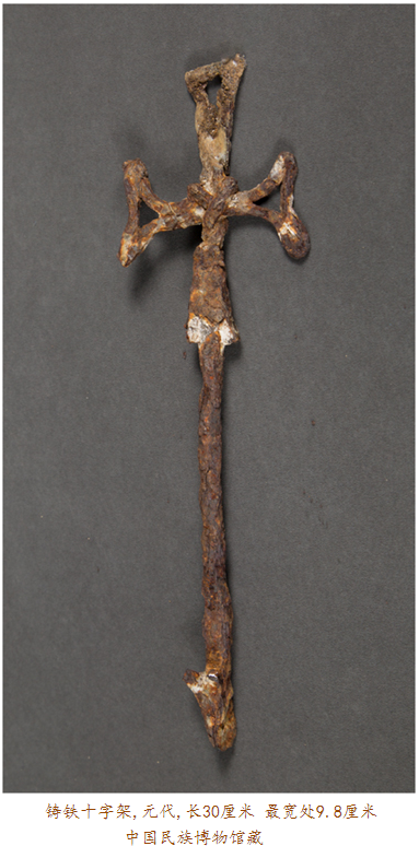 眼前此件在內(nèi)蒙古達(dá)茂旗出土的元代鎏金青銅十字架,四面排列有浮雕金剛杵紋,其正面每個(gè)金剛杵圖案上均有鎏金裝飾,十字架上部穿孔則可用于懸掛。金剛杵是藏傳佛教里的修行法器,象征力量與智慧;而十字架則是基督教文化的標(biāo)志,如此混搭,歷史便要傳遞出種種:在信仰藏傳佛教的蒙古高原,金剛杵,象征無(wú)畏圓滿,十字架,則代表救贖重生,東西方文化的結(jié)合亦呈現(xiàn)某種文明可能達(dá)到的無(wú)可比擬之高度。