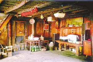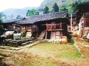 筆者看到的干欄式木樓和吊腳樓在使用的功能上相差無幾,上層住人待客,樓下四壁用木板圍擋,圈養(yǎng)畜禽,存放燒柴、農(nóng)具和秋收臨時(shí)堆放的糧食。豬圈靠里側(cè)依柱圍欄,其它空閑的地方打掃得干干凈凈,有的將織布機(jī)放在樓下明亮的地方。住房一般5間,兩頭兩間是偏廈,中間3間是寬敞的堂屋,一頭設(shè)火塘、土灶,為烤火、煮飯之處;另一頭的中柱供臨時(shí)設(shè)席敬神之用,也有的在板墻上設(shè)佛龕神位,供奉祖先;臥室依房柱用木板靈活隔間。大門有的開在房山墻一側(cè),也有開在中間的,皆登石階、板梯而上。吊腳樓一棟挨著一棟,小巷道曲折狹窄,只容牽牛和順向挑擔(dān)通過。