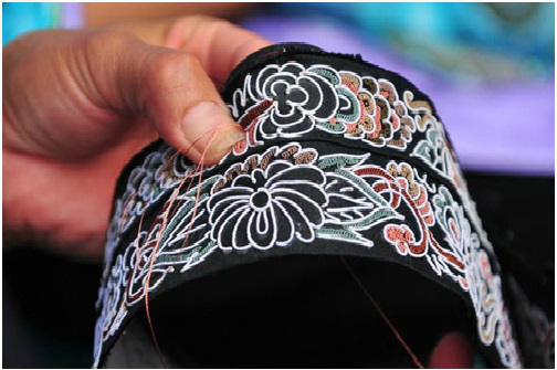 第四步是刺繡,包括三個(gè)環(huán)節(jié),即固定框架圖案、填芯和鑲邊。固定框架圖案,即用一根大針將馬尾線穿好,再用另一根稍小的針穿上同色絲線,然后一邊用馬尾線在布面上鑲成各種圖案,一邊用穿有絲線的小針將圖案固定在布面上。填芯,即用各色絲線將固定好的圖案空隙部分填滿。鑲邊,即用橙色和黑綠色絲線在四周挑繡成鑲邊圖案。