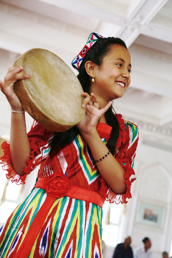 11歲的麥迪娜是小學(xué)五年級的副班長,在麥蓋提一小雙語班讀書,漢語好到可以給我做翻譯,向老藝人提問。麥迪娜的世界已經(jīng)和老藝人、和叢林中艱難漁獵的祖先不一樣了。她在麥西來甫中敲達(dá)甫手鼓,在活動中心學(xué)習(xí)電子琴,是女子“手鼓樂隊組合”中8位11—3歲女孩子中的一個。她希望將來能在北京上學(xué)、成為醫(yī)生治好奶奶的糖尿病。她會用漢語唱國歌和《歌聲與微笑》,還有《茉莉花》,雖然吐字與調(diào)子不太那么準(zhǔn)。她圍著阿布都克萊姆(被稱作“維吾爾人的趙本山”的維吾爾族諧星)索要簽名的同時,還喜歡羅志祥,以韓國偶像組合EXO為榜樣。麥迪娜還上過電視,常有喀什地區(qū)的、自治區(qū)的、全國的媒體到麥蓋提來采訪、錄制刀郎麥西來甫。