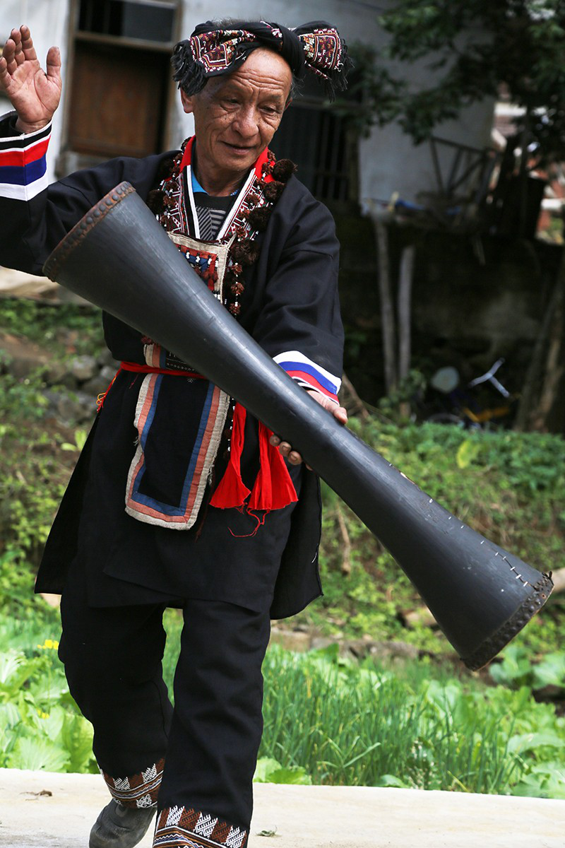 聽罷門唻歌,再賞羊角長鼓舞。轉(zhuǎn)鼓、跨步、收腿、回腰、碰角……這套由多人合作的舞蹈,動作粗獷,節(jié)奏明快,舞者配合默契,音韻鏗鏘。今年66歲的老藝人盤福貴,舞起祖宗留下來的已有一百多年歷史的羊皮長鼓,身手矯健、動作敏捷,讓人驚嘆不已。盤福貴的爺爺、父親都是跳羊角長鼓舞的高手,父親把這項技藝傳授給他,如今他又收女兒和孫子為徒,已是五代傳承了。