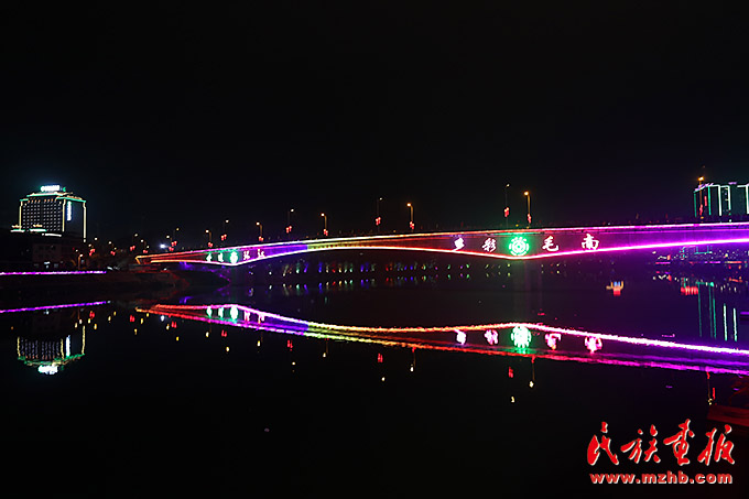11月9日通車的環(huán)江三橋不僅便利了交通,橋上的霓虹燈把夜色中的毛南山鄉(xiāng)裝點地非常美麗