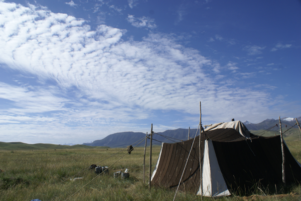 裕固族在帳篷的使用方面有許多禁忌。首先,選擇避風向陽的地點扎立帳篷,根據(jù)山形和水路確定坐向。一般是坐北朝南,也可朝西或朝東,但是忌諱帳篷門朝向北方。認為門朝北開不吉利,俗語稱“人只有到了倒霉的時候,門才朝北開”。