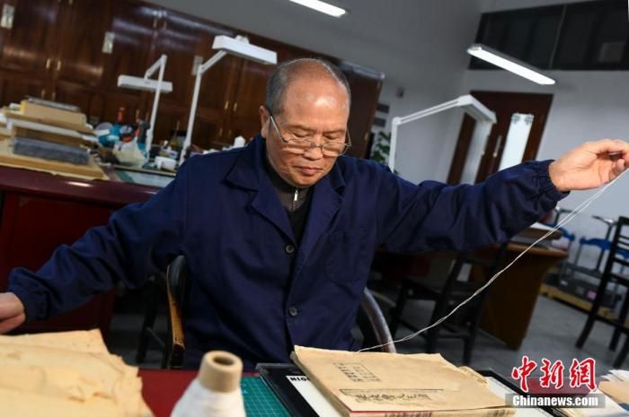 圖為師玉祥將修復(fù)完成的古籍進(jìn)行穿線(xiàn)訂書(shū)。 楊華峰 攝