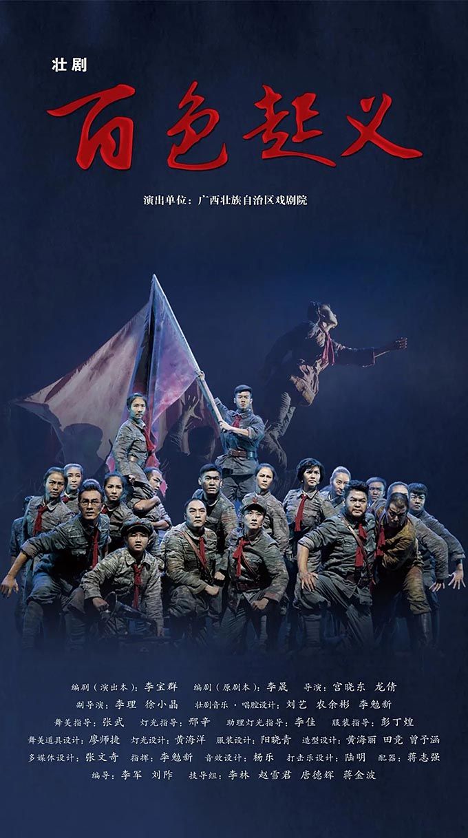 壯劇《百色起義》以1929年發(fā)生在廣西的百色起義為素材創(chuàng)作而成,以百色起義的籌備、舉行為主線(xiàn),分為初到南寧、群雄聚會(huì)、英靈歌唱、百色大地等部分,通過(guò)獨(dú)具廣西特色的壯劇方式來(lái)表現(xiàn)紅色歷史題材,塑造了鄧小平、李明瑞、韋拔群等眾多百色起義指戰(zhàn)員形象,謳歌了舍生忘死、救國(guó)救民的革命先烈和為中國(guó)革命付出巨大犧牲的壯鄉(xiāng)人民。