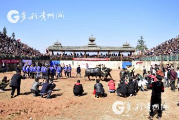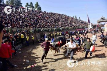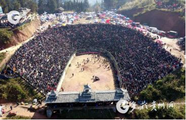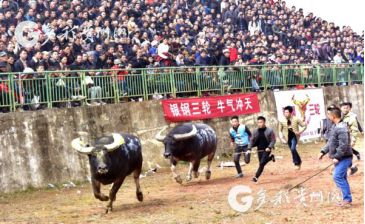 貴州省從江縣第十五屆原生態(tài)侗族大歌節(jié)的前一天,恰逢該縣逢亥斗牛日,丙妹鎮(zhèn)松學斗牛塘、谷坪鄉(xiāng)四寨河斗牛塘同時舉辦傳統(tǒng)牛王爭霸賽,喜迎一年一度“侗族大歌節(jié)”的到來,共有來自周邊村寨的80頭水牯牛參戰(zhàn),斗?;顒訄錾厦=侵?,場面異彩紛呈,吸引數(shù)萬名觀眾前來觀戰(zhàn)。