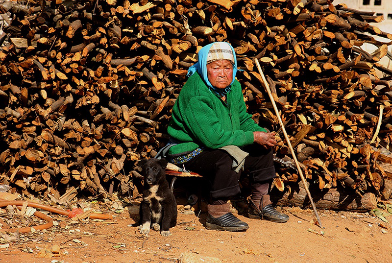 2月初的丘北,連日陰雨,是一年中最冷的時(shí)節(jié)。我先于拍攝團(tuán)隊(duì)幾天到了村里,想獨(dú)自在這里轉(zhuǎn)轉(zhuǎn),熟悉一下村民,篩選一下拍攝的人物。正當(dāng)我在一個(gè)泥濘的岔路口徘徊,尋思著是否要問(wèn)路去村主任家的時(shí)候,旁邊屋子里走出一個(gè)人,面容親善:“天好冷啊,進(jìn)來(lái)烤烤火吧!”他打招呼的方式如同熟人,一笑時(shí)露出兩排又白又整齊的牙齒。于是,他家擁擠的火塘邊又多了一個(gè)人。大家圍著火爐有一搭沒(méi)一搭地聊天,語(yǔ)調(diào)溫和小聲,沒(méi)話的時(shí)候大家也不覺(jué)得別扭,只聽(tīng)見(jiàn)玉米骨在火塘里噼啪作響。這是一個(gè)五代同堂的大家庭,招呼我的主人楊樹(shù)紅和妻子以及祖母、父母一起生活,兒子和女兒在廣東打工,已經(jīng)回村準(zhǔn)備過(guò)節(jié),兒子未婚,女兒則有了兩歲的孩子。楊樹(shù)紅的祖母出生于1922年,是這個(gè)村子里最老的老人,耳朵有些背。我大聲問(wèn)她是否還記得年輕時(shí)候踩花山,她拍著我的手背說(shuō):“17歲我就去踩花山嘎!好玩嘎!”兒媳笑著解釋說(shuō):“估計(jì)她說(shuō)的是17歲踩花山的時(shí)候碰到爺爺,被他拖媳婦拖走的事呢?!弊婺改昙o(jì)太大,看著她手上和臉上深深的褶皺,不知藏了多少往事。