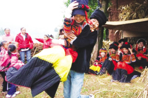 居住在滇西北和滇南等地的彝族也保留著搶婚的習(xí)俗,只是形式稍有不同。在滇西北地區(qū),男方家的人一邊給女方家送彩禮,一邊用氈子強(qiáng)行把姑娘裹走。這時(shí)女方家的人可以用假打的方式對付來搶婚的人,并把黑黑的鍋灰抹在搶婚者的臉上。搶婚的人們一個(gè)個(gè)鍋灰滿面,黑不溜秋的,常逗得賓客開懷大笑。在滇南等地,搶婚的地點(diǎn)、時(shí)間都是事先約好的,往往姑娘在田里勞動、在村邊割草或背柴回家的路上就被搶走了。搶到的姑娘直接被領(lǐng)到男方家的堂屋。這也標(biāo)志著雙方正式締結(jié)婚姻關(guān)系了。不管用什么形式搶親,把姑娘搶到新郎家后,都要按當(dāng)?shù)匾妥宓牧?xí)俗,舉行婚禮,并宴請賓客。