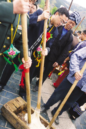 黔西南州委書(shū)記陳鳴明(中)與布依族同胞在活動(dòng)現(xiàn)場(chǎng)打糍粑