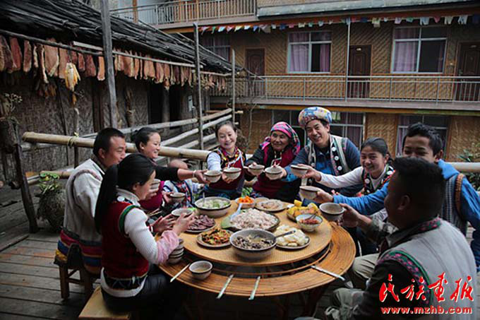 早上,老姆登村73歲的怒族老人斯普早早起來招呼兒子郁伍林、兒媳魯春花:“春節(jié)快放假了,客棧的生意會(huì)忙得不可開交,趁著現(xiàn)在客人不多,家里人先吃一頓團(tuán)圓飯吧。”斯普老伴早年過世,7個(gè)兒女中老五郁伍林在身邊照顧她。“過去在春節(jié)才能吃上一頓好飯菜,也要準(zhǔn)備很長(zhǎng)時(shí)間,現(xiàn)在每天都有好吃的,天天在過年,多虧了黨的好政策?!闭f起今天的幸福生活,生在舊社會(huì)的斯普感慨萬千。