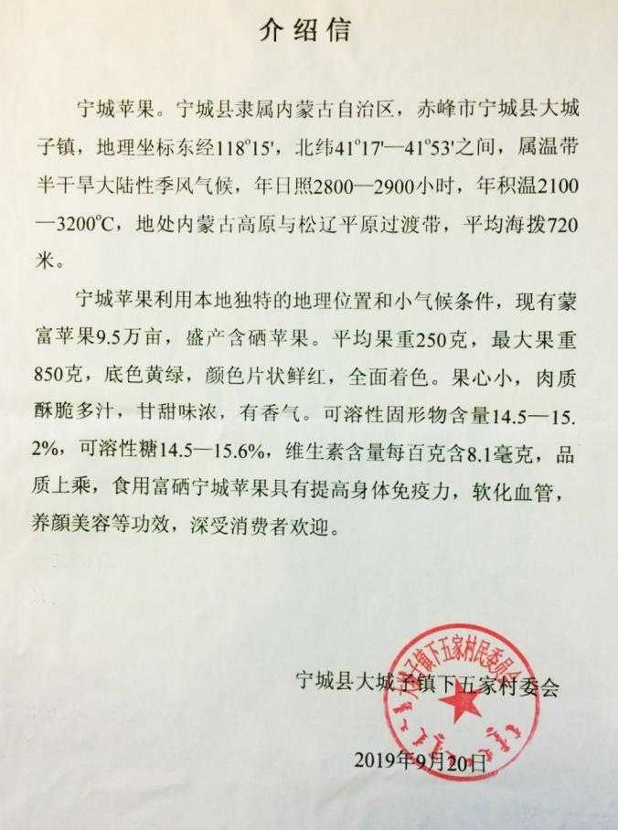 寧城蘋果是寧城縣巴林果樹試驗場與沈陽農(nóng)業(yè)大學(xué)合作,于1978年以哈爾濱東光蘋果為母本和日本富士蘋果為父本雜交而來,經(jīng)過十幾年時間選育而成的蘋果。1997年內(nèi)蒙古自治區(qū)科學(xué)委員會組織國內(nèi)著名果樹專家進(jìn)行鑒定,定名為蒙富,寓意內(nèi)蒙古的富士。2015年7月“寧城蘋果”通過國家工商總局商標(biāo)局注冊,取得“寧城蘋果”地理標(biāo)志證明商標(biāo),推動了本地蘋果產(chǎn)業(yè)健康快速發(fā)展。