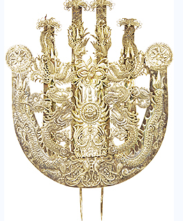 而最為極致的演繹,則要屬黔東南地區(qū)的苗族“盛飾”:黃平苗族的球形銀鳳冠,銀冠之上布滿銀花,蝴蝶、螳螂、雀鳥等動(dòng)物形象立于花間,一派生機(jī)。銀冠下緣飾有響鈴,行動(dòng)時(shí)搖曳生姿、聲色俱美;雷山西江苗族的大銀角,寬近1米,立高可達(dá)70厘米左右,面上鏨刻有雙龍搶寶的主紋,兩端尖角處可插羽毛或彩線,中央插有一把銀扇,既像鳥羽,又似太陽(yáng)放射出的光芒……