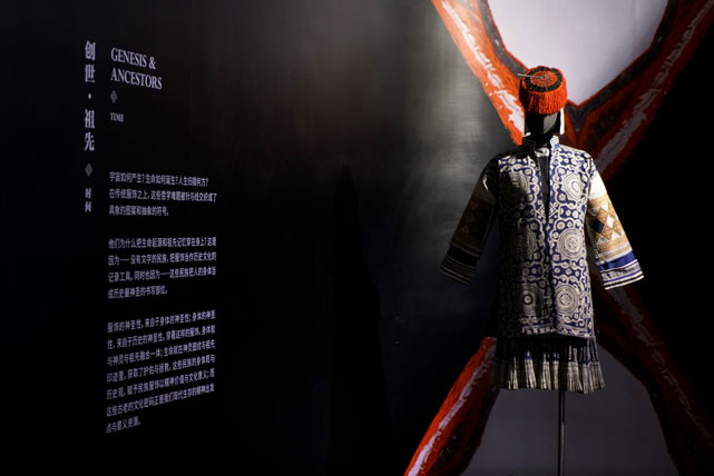 展覽呈現(xiàn)了在傳統(tǒng)服飾中,這些哲學難題被針與線在不同歷史時期交織成具象圖案和抽象符號——對于創(chuàng)世與祖先,對于人與神、天與地,傳統(tǒng)服飾成為苗、瑤、彝、侗等民族書寫與描摹的材料;服飾之上精美的紋飾,展現(xiàn)出這些民族心中神靈的形象,勾畫出民族英雄的事跡,從而建立起關(guān)于自我認識的圖景,生發(fā)出對宇宙的敬畏。