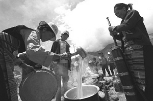 其實,在《舌尖上的中國1》里,酥油茶就亮相了。攝制組跟拍了到拉薩朝圣的一家人,他們風餐露宿,條件艱苦,但只要能起火架爐,燒一鍋滾燙的酥油茶,圍坐在篝火邊美美地喝個夠,旅途的辛勞似乎就煙消云散了。