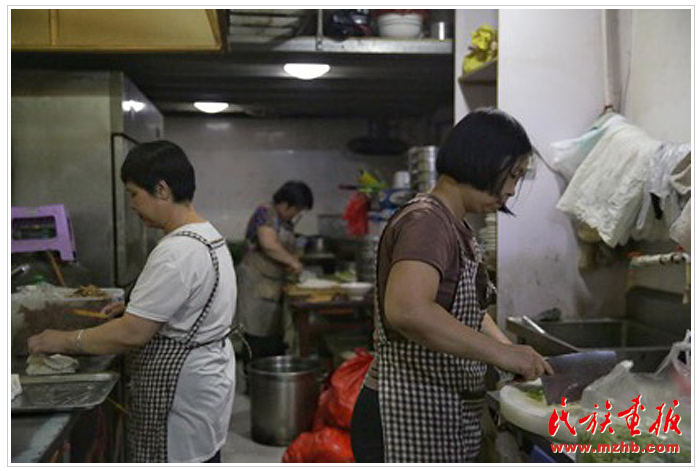 后廚忙碌的回族員工精心準備著食材