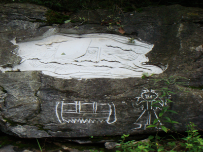 筆者在該村所見的具有“文化生態(tài)村”建設(shè)痕跡,除了村口巨石上鐫刻的文字外,還修建了一條貫通項(xiàng)目組專家們規(guī)劃的“文化生態(tài)展示區(qū)”的石板路,并在作為展示重要文化景觀的地方豎立了介紹或解釋性的文字標(biāo)牌。如,村口、山神廟前、摔跤場等都立有介紹的招牌。讓筆者疑惑和認(rèn)為不應(yīng)該“改造”的是在村民們的祖靈洞巖壁上的“藝術(shù)石刻”(見圖)。從筆者與村民的訪談和項(xiàng)目組的總結(jié)報(bào)告資料中,可以把文化生態(tài)村建設(shè)試點(diǎn)項(xiàng)目組在月湖開展的文化保護(hù)工作歸結(jié)為如下幾個方面: