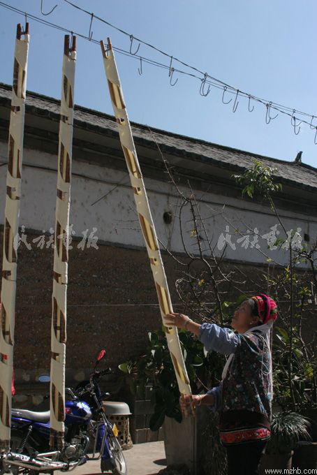 冬日里的一個午后,我來到蝴蝶泉邊的周城村,在一戶白族人家里探訪了乳扇的制作過程。剛到大門口,就聞到一股淡 淡的乳香。走進院子,只見一位白族婦女正舉著一根長長的桿子往老高老高的鐵絲上掛,院子里掛滿了一排排白花花的像是裹著白布的竹桿。走近一看,桿子上白白的東西并不是白布,向?qū)Ц嬖V我,這就是乳扇。