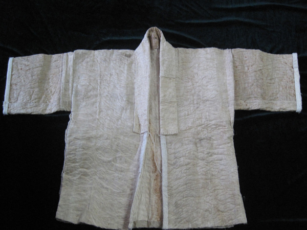 據(jù)了解,制作樹皮布的樹種有厚皮樹、黃九樹、構(gòu)樹(學(xué)名為楮樹)、見血封喉(又稱箭毒木)等,以見血封喉的樹皮加工出來的樹皮布質(zhì)地最好。制作樹皮布的步驟是:第一步:扒樹皮。首先制作能夠敲打和剝離樹皮的工具、選取樹干筆直、不長(zhǎng)節(jié)、木質(zhì)較為堅(jiān)硬的樹木,砍成長(zhǎng)40厘米、直徑為5厘米的兩根木棍。一根用刀把一頭削細(xì),用于敲打樹皮;另一跟把一頭削成木楔狀,用于剝離樹皮。根據(jù)需要制作的物件大小,扯一根藤,量一下樹干上方和下方之間的長(zhǎng)度,再用鉤刀在樹的上、下方各砍一道記號(hào),然后用木棍在記號(hào)的范圍內(nèi)敲打樹皮,使其蓬松,與樹干分離。在敲打的過程中,有經(jīng)驗(yàn)者通過聆聽木棍敲打在樹干上的聲音,就可以辨別出哪里還沒有敲打夠,于是繼續(xù)敲打該處,直到感覺整個(gè)樹皮已經(jīng)與樹干完全分離,這時(shí)才用鉤刀在上、下方作記號(hào)的地方把樹皮砍一圈,中間用刀豎著劃一道口子,再用特制的木楔棍一點(diǎn)一點(diǎn)地撬樹皮,將樹皮進(jìn)行片狀剝離。第二步:休整。將剝離下來的整塊樹皮壓平,除掉表皮,削掉節(jié)疤,拍打樹皮纖維,使其松動(dòng)。第三步:漂洗。在水中進(jìn)行搓洗拍打,脫去樹膠,保留軟狀的樹皮纖維。第五步:曬干。將脫膠后洗凈(含有大量水分)的樹皮纖維晾干。第六步:拍打。把曬干的樹皮纖維拍打整平,使樹皮纖維分布均勻,呈片狀,于是制成樹皮布。最后將樹皮布裁剪、縫綴??p制樹皮衣的工序是:先把軟狀的單層樹皮布折成雙層,按人體結(jié)構(gòu)的大小裁剪出領(lǐng)口、袖口,再用自制的麻線縫綴成衣物。