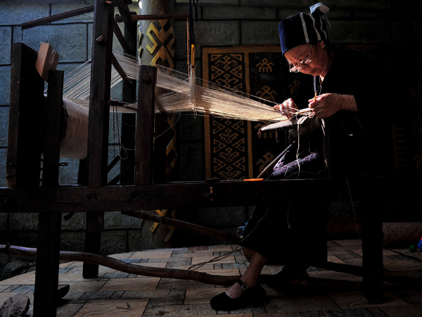 “織”是指使用踞腰織機(jī),采用通經(jīng)斷緯的紡織方法織出各種花紋圖案,在織布時(shí),先手工掛經(jīng),綁住藤或樹皮布腰帶,用腳踩織機(jī)的經(jīng)線木棍,席地而坐織布??椈ㄊ怯煤谏蛩{(lán)黑色做底線(經(jīng)線),根據(jù)圖案需要,將各種染色的線搭配,拉經(jīng)線、投緯線(彩色線),用木刀打緊緯線,織出各種花紋圖案。