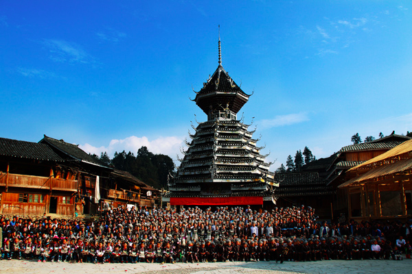 每年的農(nóng)歷八月十五中秋節(jié),小黃都會舉行賽歌會,有幾十上百人唱歌的壯觀場面,是觀賞侗歌的最佳時機。侗族的大歌表演常在鼓樓舉行。侗族的鼓樓、風雨橋和大歌是侗族原生文化最突出的標志,被稱作“侗寨三寶”。鼓樓是侗族村寨的標志性建筑,形似巨大的杉樹,村民稱之為“遮蔭樹”。在沒有鼓樓的年代,人們的許多活動是在古杉樹下進行的。后來,為了滿足社會和文化活動的需要,修建固定建筑物時便以杉樹為原型。文獻資料稱:“侗人居溪峒中,春以巨木埋地作樓,高數(shù)丈,歌者夜則緣宿其上。”這就是最初的“鼓樓”。