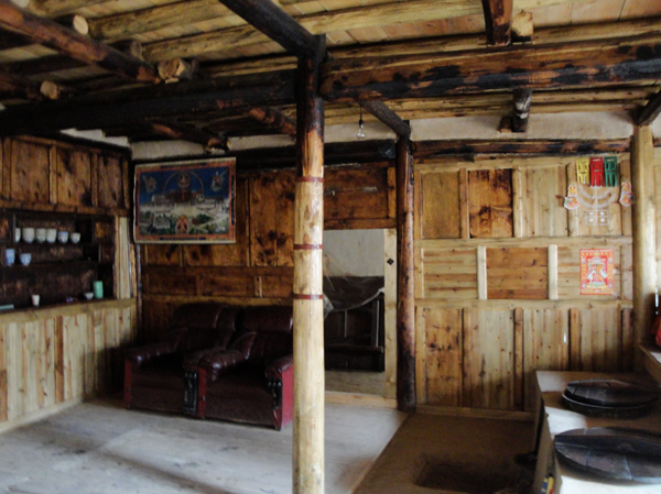 為改善狹小的寨內(nèi)空間,當?shù)鼐用窬藿硕幽窘Y(jié)構(gòu)樓房,和青海鄉(xiāng)村民居庭院寬敞的特點形成了反差。寨內(nèi)民居庭院多為四合院式,房屋為土木結(jié)構(gòu)平頂房,一般民居都有飛椽花藻之類。屋內(nèi)一般以木板作隔扇,室內(nèi)有護炕木板、護墻木板墻圍,且多雕花草于其上。房屋一般面闊三間,正面以木板隔墻并裝上木板條方格小花窗。佛堂設(shè)在二樓,佛堂所在的房屋一般都是上房,和佛堂不同向的兩邊廂房一般做臥室。院落中央一般都有豎掛經(jīng)幡的旗桿,還設(shè)有桑臺,具有明顯的藏式特點。