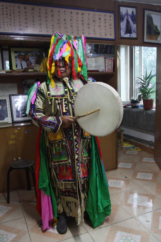 冬天穿的鞋是“奇哈密”和“溫得”,“奇哈密”是用狍脖皮或犴皮做靴底,用狍腿皮拼縫成靿的短靴。“溫得”是用鹿或犴皮做底,鹿或犴腿皮拼縫成靿的長(zhǎng)靴?!皽氐谩币?yàn)殪壐?,冬天穿著打獵不易灌雪。這兩種靴子都要用冬季絨毛狍皮做成的襪子配套穿用,暖和跟腳,踩在雪地上沒有聲響。夏天一般穿“奧勞其”,是一種皮底布靿短靴?!翱己袈洹?,是用冬季絨毛狍皮縫制的二指手套,掌面腕部留一縫口,手從縫口中伸出,手套仍護(hù)在手背上,既使在零下40度的嚴(yán)寒中處理獵物,也不用擔(dān)心手被凍壞。還有一種五指狍皮手套,背面正中繡花、蝶等中心圖案,五指的關(guān)節(jié)和指甲處繡出各種小型圖案,然后用連理枝將中心圖案和關(guān)節(jié)、指甲圖案連為一體,中心圖案代表手掌,手指圖案代表關(guān)節(jié)和指甲,連理枝代表骨骼和血脈(圖為越來(lái)越鮮見的薩滿服飾,吳雅芝供圖)。
