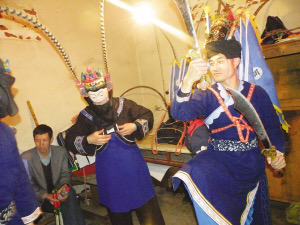 請“臉子”是地戲表演時一個非常講究的開場儀式?!巴捅さ貞颉钡恼埬樧觾x式通常是整個戲班子的人都必須參加祭拜。表演時必須鄭重地從箱子里請出珍藏的“臉子”,“臉子”才具有神的靈性。可是我們看到的大寨布依地戲,在保持傳統(tǒng)的同時又不失自己的個性。通常請“臉子”是由當(dāng)?shù)亻L老一個人完成所有的祭拜過程,一切都是那么簡單。祭拜中都是用當(dāng)?shù)氐牟家涝掓告傅纴?,這樣的表演給它增添了別有的韻味。