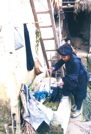 紡紗、織布、藍(lán)染,是哈尼族婦女制作服裝的重要組成部分。她們?cè)诳棽记耙龅臏?zhǔn)備工作,就是操動(dòng)制線(xiàn)機(jī),把一根根短小的線(xiàn)連接起來(lái),捲在小木棍上,然后操動(dòng)絞線(xiàn)機(jī),把線(xiàn)棍上的線(xiàn)分開(kāi)絞在木梭子和木輪子上。接著是分線(xiàn),人數(shù)不限,但不能少于5人,一般10米為一組線(xiàn)??棽紩r(shí),在織布機(jī)上方搭起兩排密集的線(xiàn)網(wǎng),當(dāng)雙腳踩動(dòng)踏板時(shí),兩排線(xiàn)網(wǎng)一上一下地交叉移動(dòng),將拖著線(xiàn)的梭子一次次地左右穿梭于線(xiàn)網(wǎng)中。這樣重復(fù)地進(jìn)行,就織出一筒筒布,一般10米為一筒布。最后把織成的布放入靛缸里泡洗,曬干后就可以制作服裝了。
