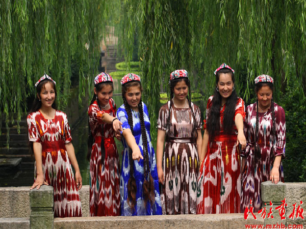 如果說苗族服飾是苗族的一部“無字史書”的話,那新疆維吾爾族的艾德萊斯綢和小花帽則是維吾爾族熱情奔放性格的集中體現(xiàn)。艾德萊斯綢質地柔軟,輕盈飄逸,非常適合縫制夏裝。按顏色分為黑艾德萊斯、紅艾德萊斯、黃艾德萊斯和多色艾德萊斯。紅艾德萊斯綢圖案為紅色,底色用黃色或白色,富于青春氣息,深受姑娘和少婦的喜愛。黃艾德萊斯綢圖案為黃色,在各種底色的襯托下顯得莊重而典雅,顯示一種富貴氣息,一般在制成中青年婦女服裝的時候使用。綠艾德萊斯綢多用來縫制學齡前兒童的女裝。維吾爾族無論男女老幼,不分春夏秋冬,都喜歡戴一種維吾爾族語稱為“朵巴”的小花帽,制作小花帽運用絲線平繡、絲線結繡、串珠片繡、格子架繡、盤金銀繡、十字花繡、鉤花刺繡、扎絨刺繡以及刺、扎、串、盤等技法,將花卉果實等圖案匯集在帽子中,使小花帽的顏色豐富多彩。