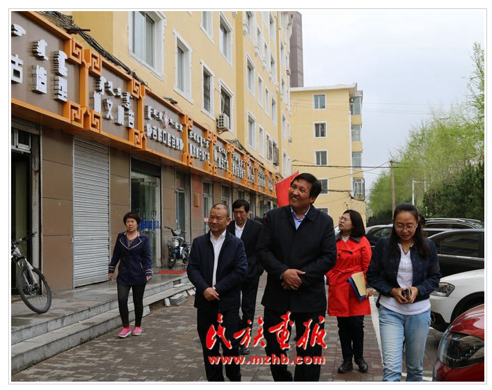 2017年5月3至4日,內(nèi)蒙古自治區(qū)民委副主任薩楚日勒?qǐng)D(前左二)、語(yǔ)文處處長(zhǎng)曹雙喜(前左一)檢查呼和浩特市的蒙漢雙語(yǔ)牌匾情況(民族畫(huà)報(bào)資料)